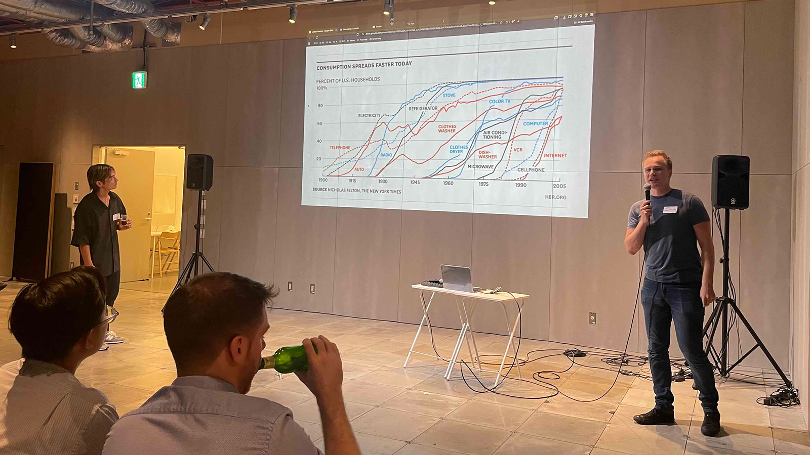 1つ目は、アメリカ・カナダ・日本など世界中を移動しながらGen AIコンサルティングを続けるコミュニティメンバーによる、Gen AIのエンタープライズ企業における活用のティップスでした。2つ目は、LEDを駆使して空間を作り上げるVision Xのファウンダーから、LEDを使った創造的かつ未来的な空間に関するアイデアを共有していただきました。3つ目は、日本と世界を繋ぐエコシステムを構築したTakeoff Tokyoファウンダーから、日本と世界の現在地や今後の発展についてお話しいただきました。