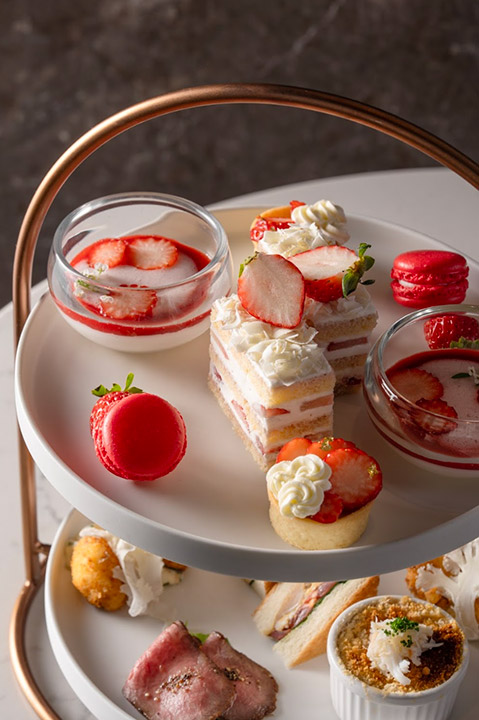 旬の苺をふんだんに使用した華やかなスイーツと、冬の食材を活かしたセイボリーが並びます。